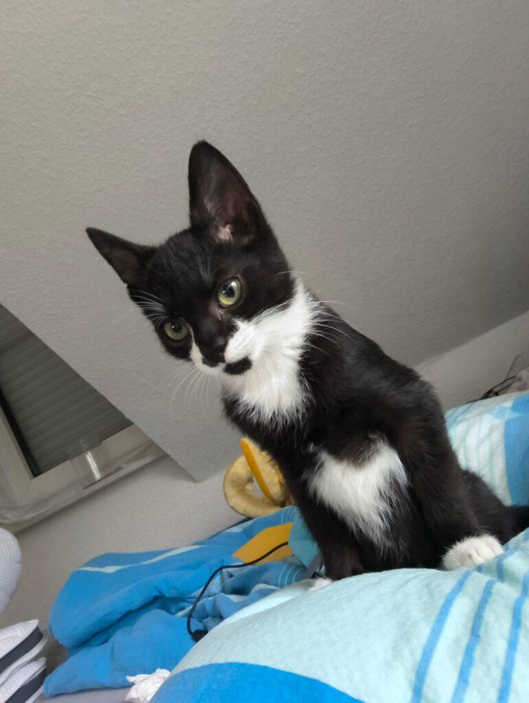 Dieser junge Kater sieht zwar aus wie ein Engel – aber hinter dem unschuldigen Blick steckt ein echtes Energiebündel! Er ist extrem verspielt, wild und voller Tatendrang. Kein Regal ist ihm zu hoch, kein Vorhang sicher, und selbst Menschenbeine werden schon mal als Kletterhilfe genutzt. Auch Möbel und Kratzbäume bekommen regelmäßig seine volle Aufmerksamkeit.