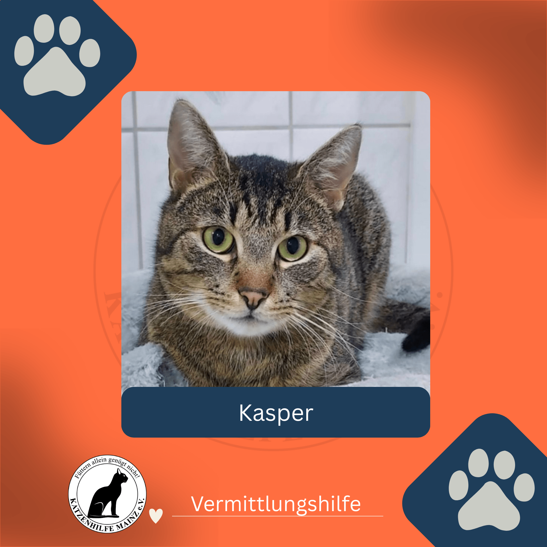 Kasper ist ein großer, wunderschöner Bilderbuch-Tiger! Er führte bisher ein unversorgtes Streunerleben. Durch das Einfangen zur Kastration hat man festgestellt,